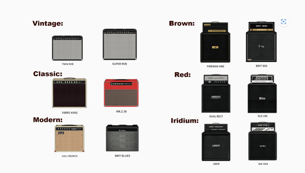 Vintage(Fender Twin Reverb), Classic(Fender Vibro King), Modern(Mesa Boogie Mark I), Brown(Friedman HBE), Red(Mesa Boogie Dual Rectifier), and Iridium(Bogner Uberschall)