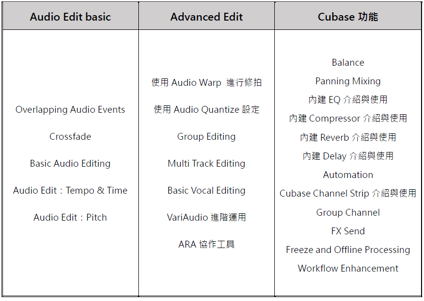 課程訓練分為三個區塊分別為剪輯、Cubase功能以及混音實作,為你調整出專業音色打下良好基礎!